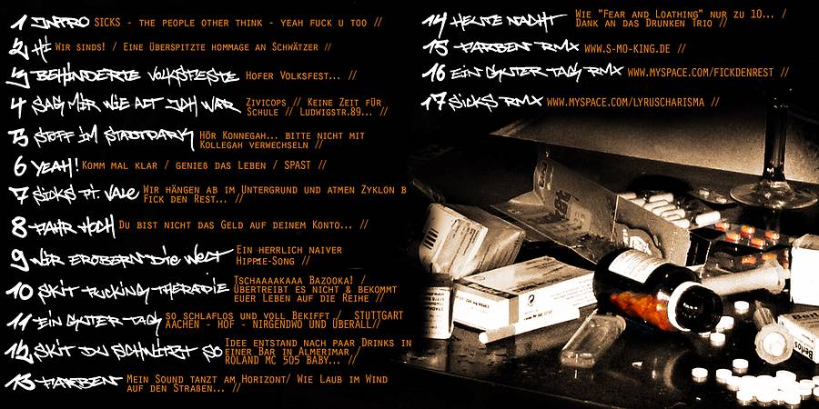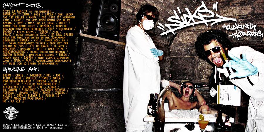 SICKS - Fucking TherapieRelease: 11.9.09 Beschreibung: DIE THERAPIE EINES NAHESTEHENDEN ATZENS! Wie gewohnt ist alles natürlich wieder eine Eigenproduktion, KEIN geringerer als S MO KING hat die Produktion aller Beats sowie das Mastering übernommen !!! DAS ALBUM GIBT ES HIER ZUM FREE (!!!) DOWNLOADDas schreibt die Juice über das Album So stellte S MO das Album in der Phat-Show vor (komplettes Feature inkl. div. Tracks) Tracklist(Titel mit * können auf Klick komplett angehört werden!!) Snippet |